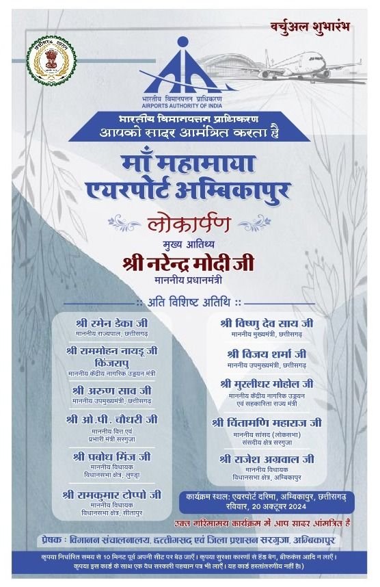 अंबिकापुर के दरिमा मां महामाया विमान तल का उद्घाटन 20 अक्टूबर को होगा।