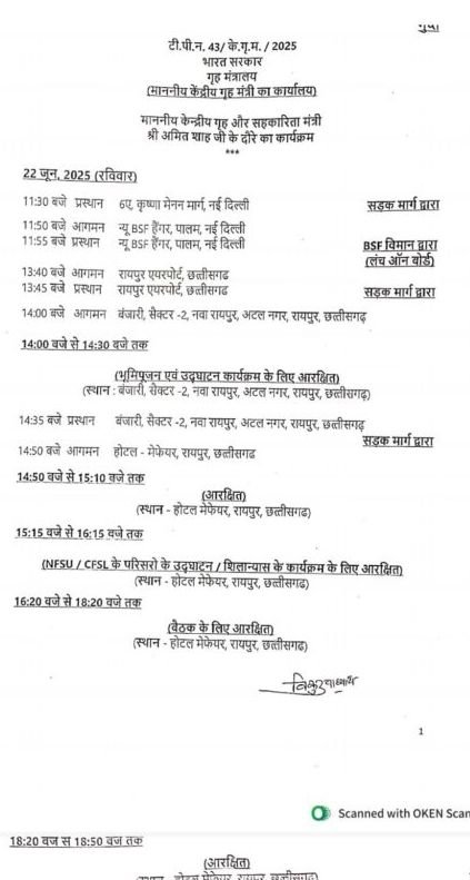 23 जून को अमित शाह रायपुर से नारायणपुर जाएंगे वहां विभिन्न कार्यक्रम में भाग लेकर राजधानी रायपुर आएंगे।