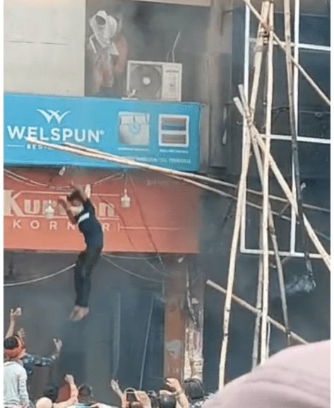 फंसे लोग जान बचाने छत से कूदे आमजन मदद कर रहे हैं।