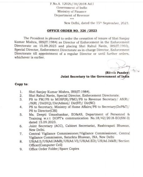 भ्र्ष्टाचार पर कार्यवाही के लिए पूरे देश में आज ईडी का नाम लोगों की जुबान पर है!आज ईडी के तेजतर्रार डायरेक्टर संजय कुमार मिश्रा का कार्यकाल समाप्त हो गया! अब इस पद पर आई आर एस राहुल नवीन की नियुक्ति की गईं है!
