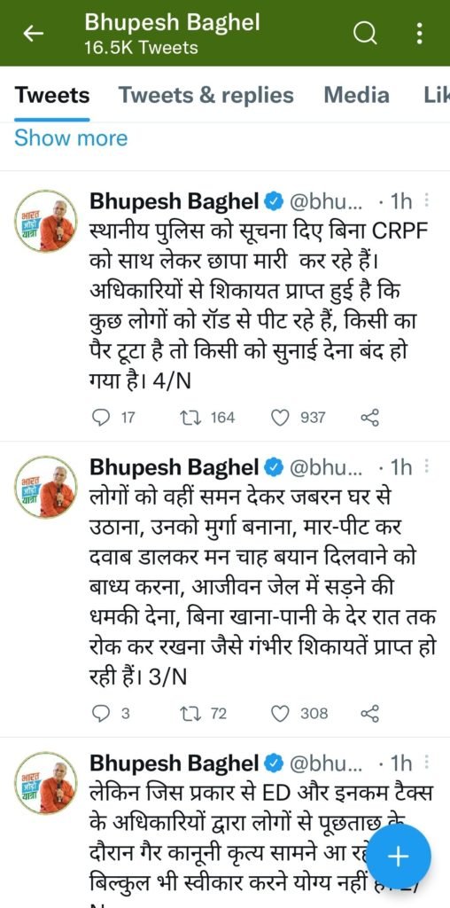 एक के बाद एक ट्वीट से छत्तीसगढ के मुख्यमंत्री भूपेश बघेल ने ईडी पर सीधे सीधे आरोप लगा डाला है।