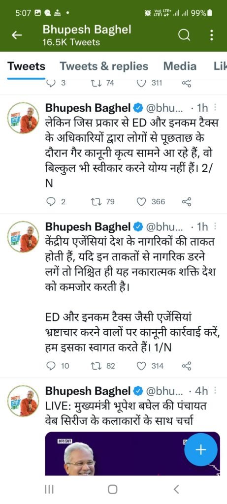 ईडी छत्तीसगढ में लगातार कार्यवाही कर रही है।आज छत्तीसगढ के मौख्यमंत्री भूपेश बघेल ने केंद्रीय एजेंसी को लेकर एक के बाद एक लगातार 6 ट्वीट कर डाले।