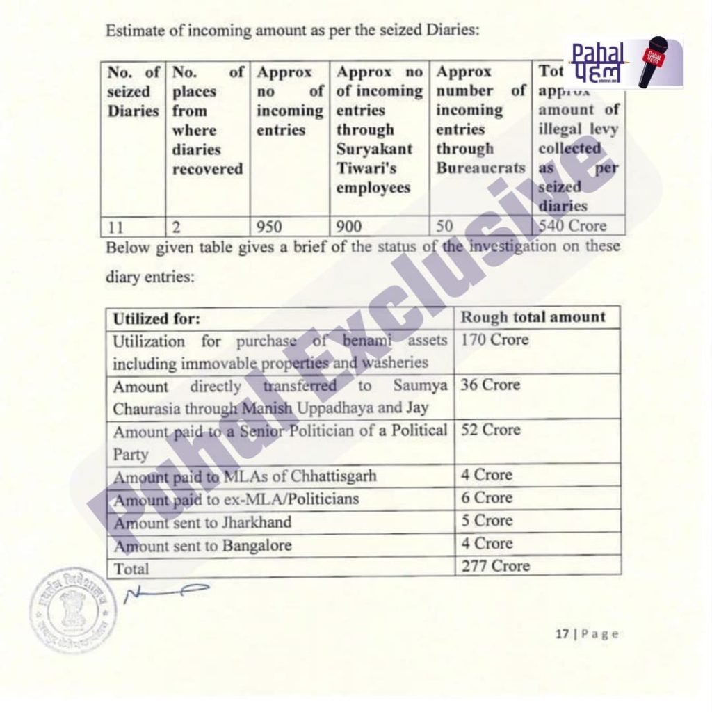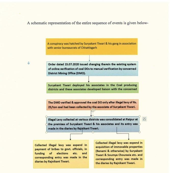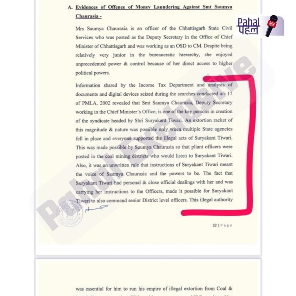 आयकर विभाग द्वारा साझा की गई जानकारी और PMLA, 2002 की धारा 17 के तहत जब्त किए गए दस्तावेजों और डिजिटल उपकरणों के विश्लेषण से पता चला है कि मुख्यमंत्री कार्यालय में कार्यरत उप सचिव, सौम्या चौरसिया, प्रमुख व्यक्तियों में से एक हैं। सिंडिकेट के मुखिया सूर्यकांत तिवारी हैं। चूंकि इस परिमाण और प्रकृति का जबरन वसूली रैकेट तभी संभव था जब कई राज्य की एजेंसियां इसमें संलिप्त रहीं और सभी ने सूर्यकांत तिवारी के अवैध कार्यों का समर्थन किया। यह सौम्या चौरसिया के कारण संभव हुआ था ताकि कोयला खनन ज़िलों में दबंग अधिकारी तैनात किए जा सकें जो सूर्यकांत तिवारी की बात सुनें।