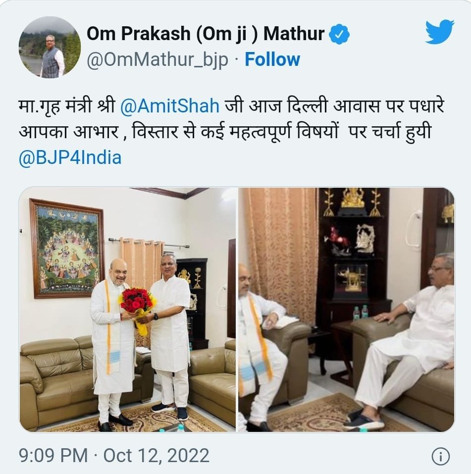 12 अक्टूबर 2022 दिन बुधवार को देश के गृह मंत्री अमित शाह नई दिल्ली के निवास पर ओम माथुर से मिलने पहुंचे।