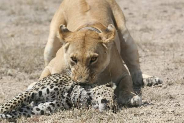 चित्र इंटरनेट से लिया गया है। इसमें एक शेरनी चीते की हत्या कर रही है। अफ्रीका के जंगलों में हत्या के ऐसे मामले अक्सर ही सामने आते रहते हैं।”