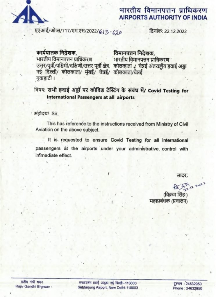 इसमें अंतरराष्ट्रीय यात्रा कर रहे यात्रियों की कोविड टेस्टिंग के लिए लिखा गया है।