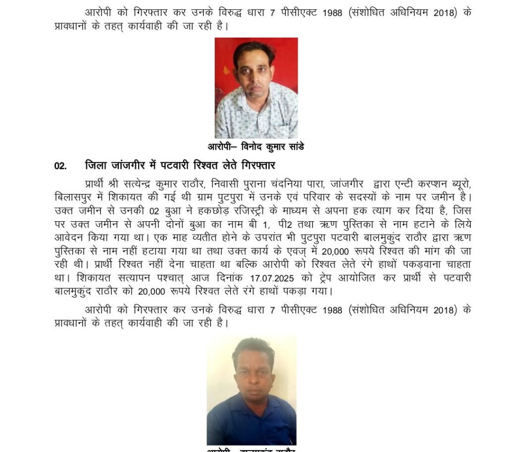 प्रार्थी श्री सत्येन्द्र कुमार राठौर, निवासी पुराना चंदनिया पारा, जांजगीर द्वारा एन्टी करप्शन ब्यूरो, बिलासपुर में शिकायत की गई थी ग्राम पुटपुरा में उनके एवं परिवार के सदस्यों के नाम पर जमीन है। उक्त जमीन से उनकी 02 बुआ ने हकछोड़ रजिस्ट्री के माध्यम से अपना हक त्याग कर दिया है, जिस पर उक्त जमीन से अपनी दोनों बुआ का नाम बी 1, पी2 तथा ऋण पुस्तिका से नाम हटाने के लिये आवेदन किया गया था। एक माह व्यतीत होने के उपरांत भी पुटपुरा पटवारी बालमुकुंद राठौर द्वारा ऋण पुस्तिका से नाम नहीं हटाया गया था तथा उक्त कार्य के एवज् में 20,000 रूपये रिश्वत की मांग की जा रही थी। प्रार्थी रिश्वत नहीं देना चाहता था बल्कि आरोपी को रिश्वत लेते रंगे हाथों पकड़वाना चाहता था। शिकायत सत्यापन पश्चात् आज दिनांक 17.07.2025 को ट्रेप आयोजित कर प्रार्थी से पटवारी बालमुकुंद राठौर को 20,000 रूपये रिश्वत लेते रंगे हाथों पकड़ा गया।