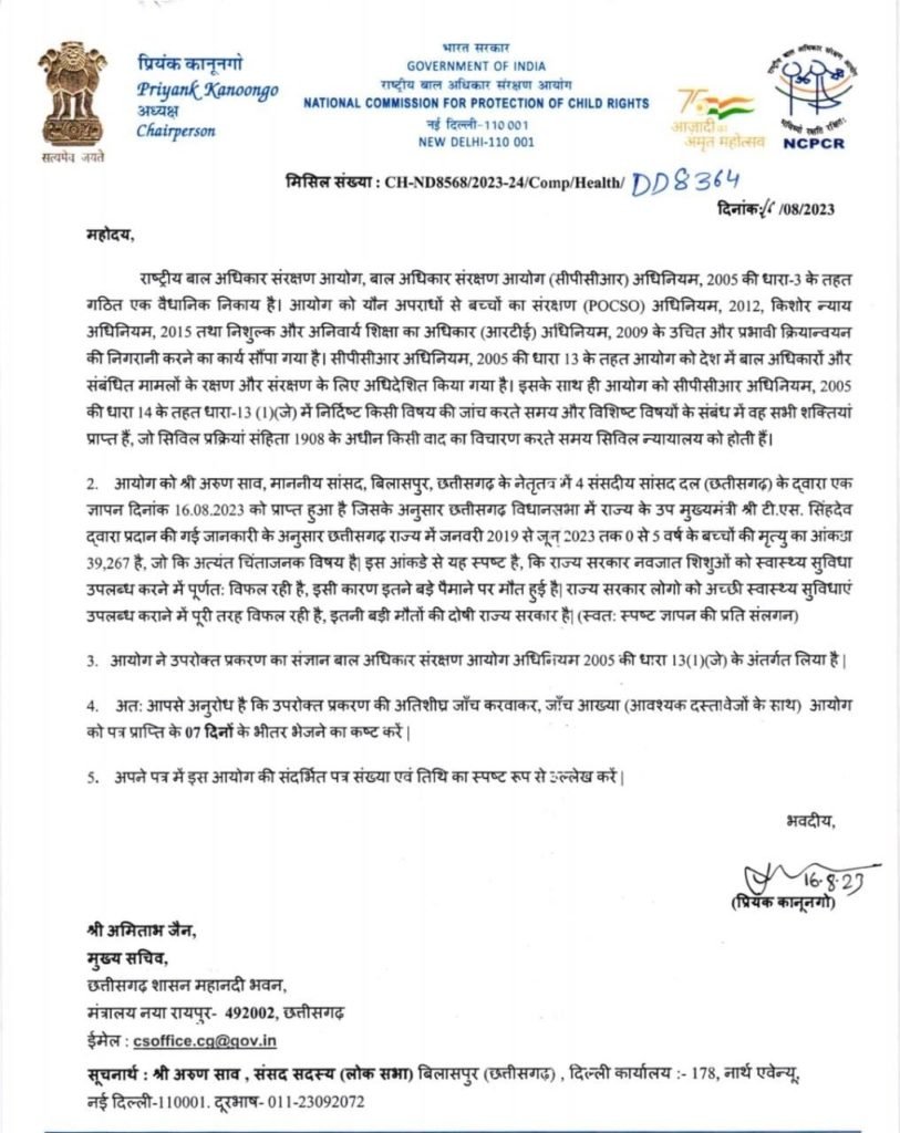 रायपुर। छत्तीसगढ़ में 39 हजार से अधिक शिशुओं की मौत के मामले को राष्ट्रीय बाल अधिकार संरक्षण आयोग ने संज्ञान लेते हुए राज्य के मुख्य सचिव को जांच कराकर 7 दिन में रिपोर्ट भेजने के निर्देश दिए हैं। प्रदेश भाजपा अध्यक्ष सांसद अरुण साव के नेतृत्व में भाजपा सांसदों ने राज्य में कांग्रेस राज में 39 हजार से अधिक शिशुओं की मौत के लिए सरकार को जिम्मेदार करार देते हुए राष्ट्रीय बाल संरक्षण आयोग अध्यक्ष प्रियंक कानूनगो से कार्रवाई करने की मांग की थी। साव के नेतृत्व में सांसद विजय बघेल, गोमती साय, गुहाराम अजगल्ले ने आयोग को तथ्यात्मक शिकायत की थी।