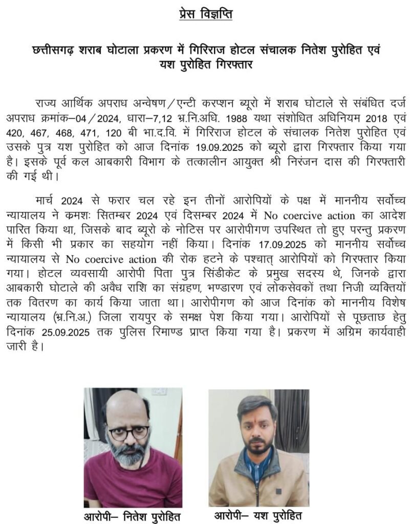 छत्तीसगढ़ शराब घोटाले में गिरिराज होटल के संचालक और उसके पुत्र को आज EOW ने गिरफ्तार कर लिया है। ये दोनों फरार चल रहे थे जिन्हें आज गिरफ्तार कर कोर्ट में पेश किया गया। दोनों को 25 तक रिमांड पर लिया गया है। कल ही आईएएस निरंजन दास को गिरफ्तार किया गया था।