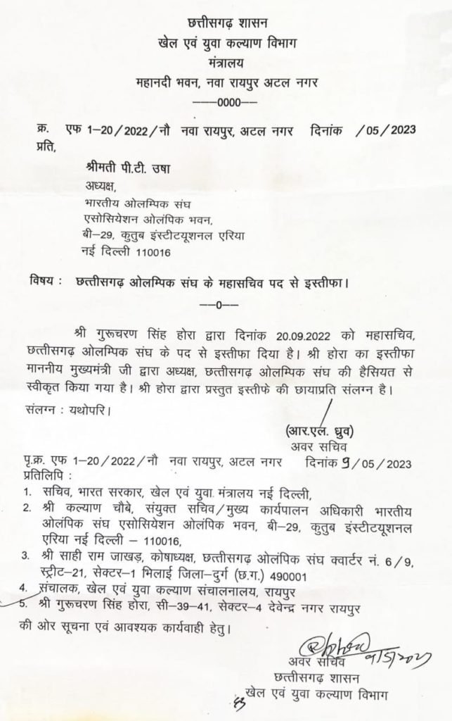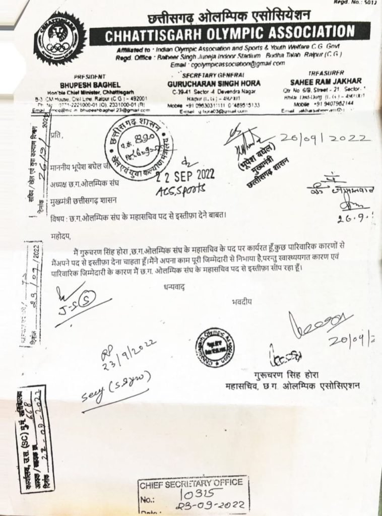 छत्तीसगढ़ के मुख्यमंत्री और छत्तीसगढ़ ओलंपिक संघ के अध्यक्ष भूपेश बघेल ने छत्तीसगढ़ ओलंपिक संघ के महासचिव के पद से दिए गुरुचरण सिंह होरा द्वारा त्यागपत्र को स्वीकृत कर लिया है।