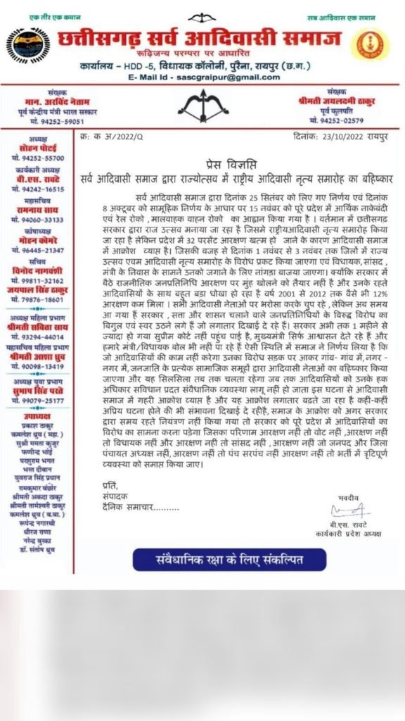 देखिए छत्तीसगढ सर्व समाज के द्वारा जारी की गई विज्ञप्ति।