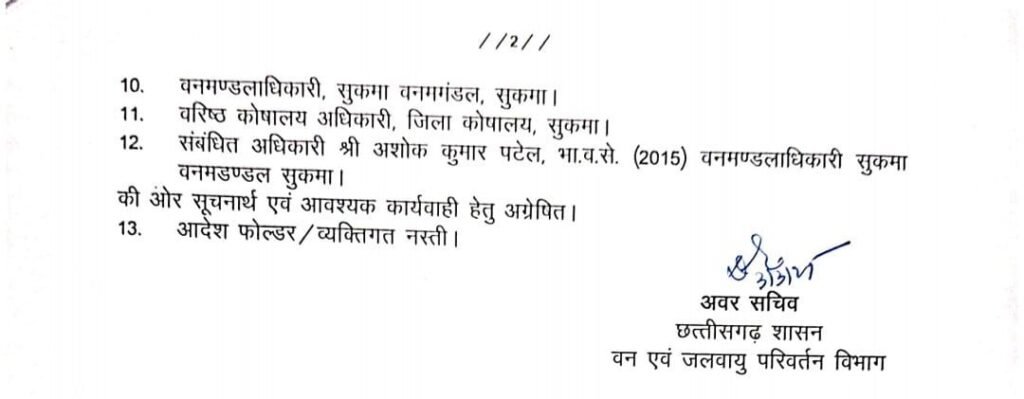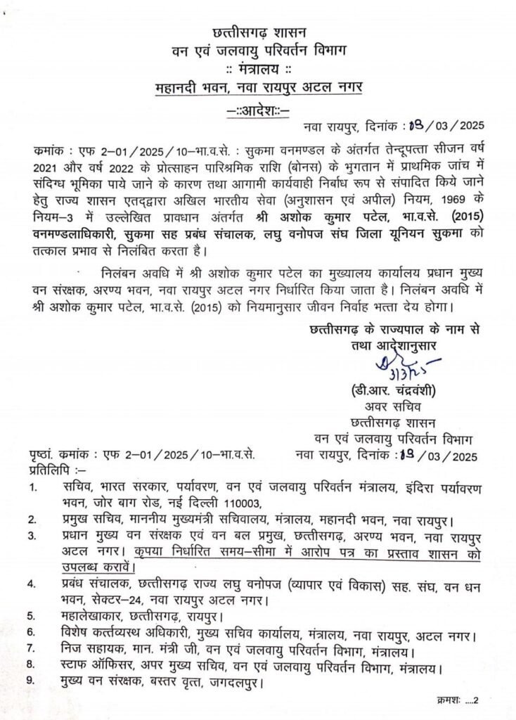 अंततः बस्तर संभाग के सुकमा जिला मुख्यालय के वन मंडल अधिकारी को निलंबित कर ही दिया गया आदेश की कॉपी अब विधान सभा सत्र में चर्चा का विषय है।