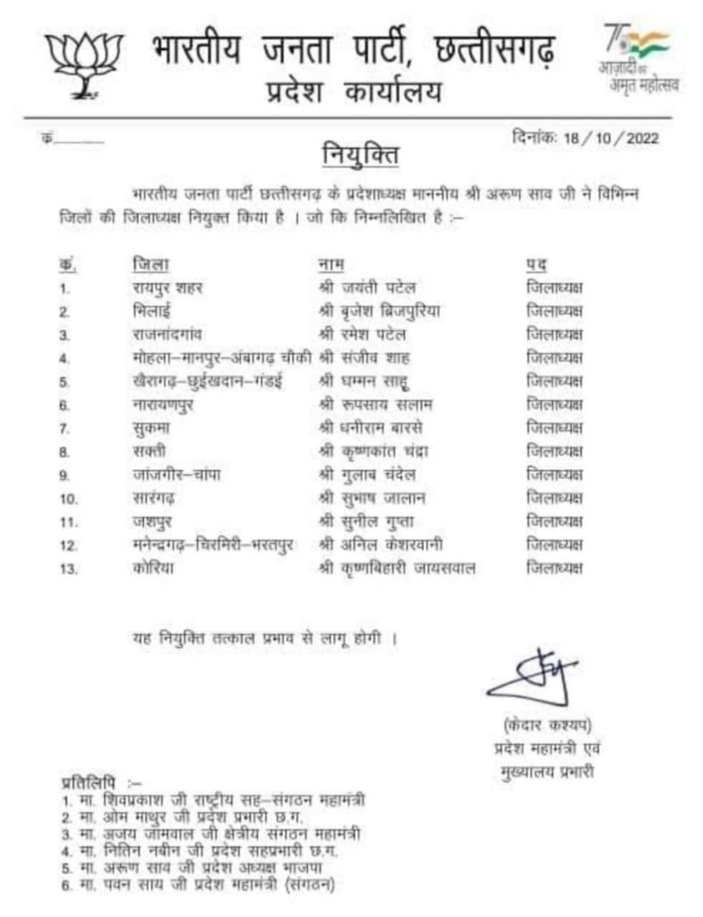 देखिए छत्तीसगढ मे भाजपा जिलाध्यक्ष की सूची