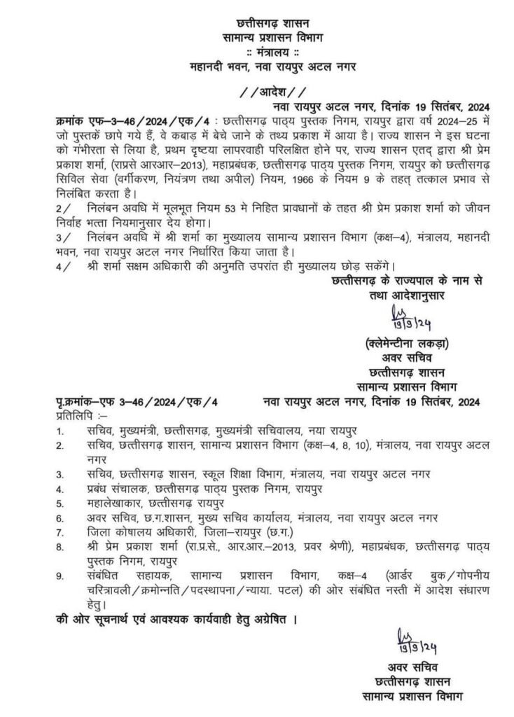 सरकारी स्कूलों में बंटने वाली किताब को रद्दी के ढेर में एक मिल में भेजे जाने के मामले के तूल पकड़ने के बाद अब आज राज्य सरकार ने पाठ्यपुस्तक निगम के महाप्रबंधक प्रेम प्रकाश शर्मा को निलंबित कर दिया है।