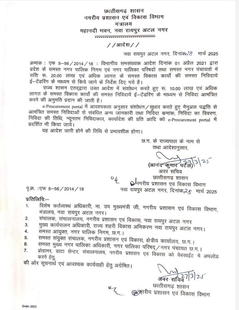 10 लाख से अधिक के कार्यो की ऑनलाइन  निविदा होगी।पहले 20 लाख तक के काम गुप्त निविदा में किए जाते थे लेकिन इस आदेश से अब पारदर्शिता लाने के लिए ये आदेश महत्वपूर्ण माना जा रहा है।