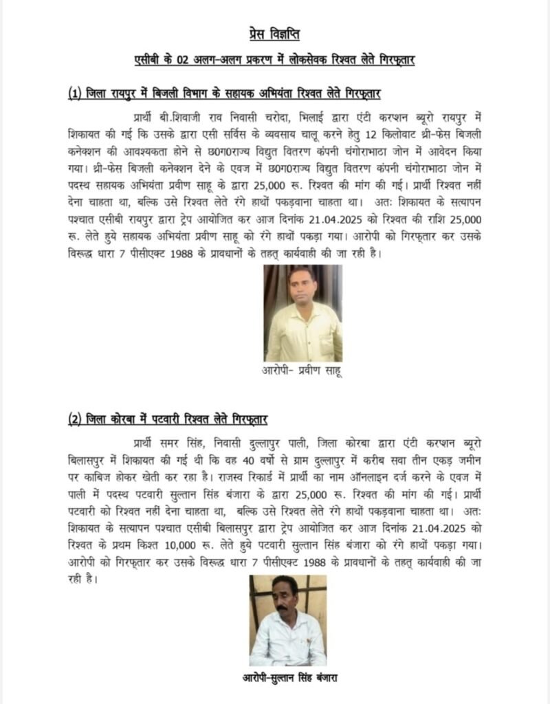 छत्तीसगढ में आज एंटी करप्शन ने अलग अलग मामले में 2 लोगों को रंगे हाथ रिश्वत लेते दबोचा है जबकि 3 को घोटाले में। साथ ही प्रेस विज्ञप्ति जारी कर सभी के नाम और प्रकरण की पूरी जानकारी दी है।
