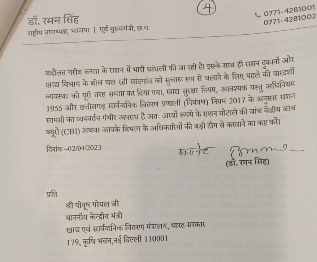 गौरतलब है कि कांग्रेस सरकार के समय पूर्व मुख्यमंत्री डॉ रमन सिंह ने स्वयं केंद्रीय मंत्री पीयूष गोयल को पत्र लिखा था कि राशन घोटाले की जाँच सीबीआई के द्वारा हो मगर भाजपा की सरकार आते ही आज इस बड़े घोटाले की जाँच सीबीआई को न देना सरकार पर कुछ सवाल खड़े कर रहा है!