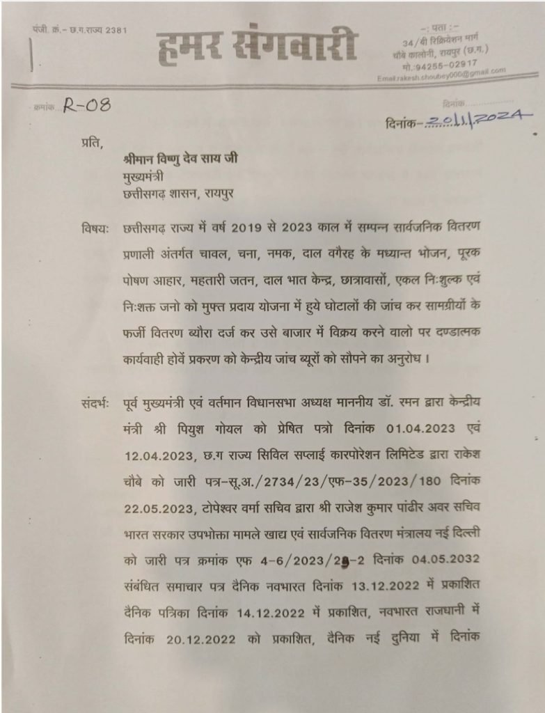 अब आज राकेश चौबे ने एक विज्ञप्ति जारी कर भाजपा सरकार से तर्क संगत प्रश्न किया है -छत्तीसगढ़ में हुए चावल घोटाले की शिकायत हमारी संस्था की ओर वर्तमान मुख्यमंत्री विष्णु देव साय जी दिनांक 20/1/2024 भेजा गया था । साथ में हमने मांग कि जांच केंद्रीय एजेंसी सीबीआई को सौंप जाए क्योंकि पूर्व विधानसभा में सीएजी ने भी रिपोर्ट सौंपी चुकी है। ऐसे में विधानसभा की समिति से जांच करने के ‌पीछे क्या औचित्य है? केंद्रीय एजेंसी सीबीआई अगर जांच करती है तो दूध का दूध पानी का पानी हो जाएगा क्योंकि रिपोर्ट सीएजी का भी है ऐसे में सवाल खड़ा होना स्वाभाविक है हमारी शिकायत पर ध्यान दी जाए राकेश चौबे मोबाइल नंबर 9425502917!