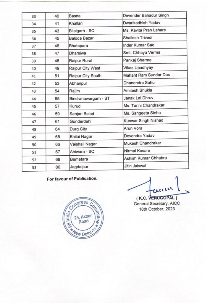 छत्तीसगढ़ के 53 उम्मीदवारों की सूची जारी