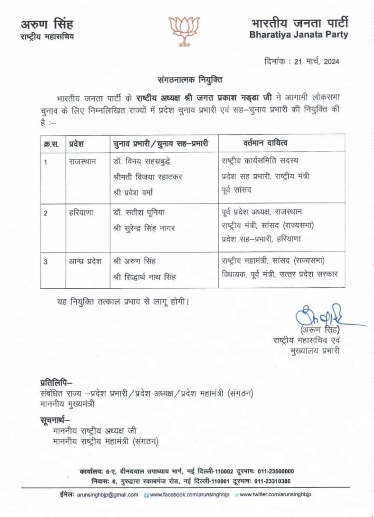 दक्षिण भारत में भाजपा ऐसे लोगों को भेज रही है जो संगठन में बेहद तेज तर्रार छवि वाले माने जाते हैं इस कड़ी में आंध्रा जैसे महत्वपूर्ण राज्य की जिम्मेदारी सीधे तौर पर भाजपा के महामंत्री अरुण सिंह को दे दी है और इनके साथ कुशल प्रबंधन के धनी और यू पी के पूर्व मंत्री व विधायक सिद्धार्थ नाथ सिंह को भी दी है!