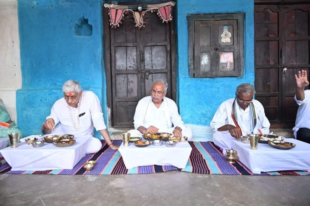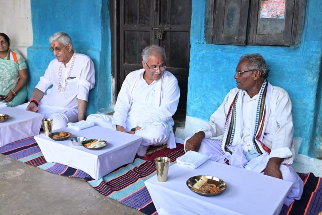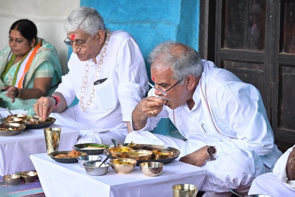 मुख्यमंत्री बघेल ने किसान मोहन के घर कांसे की थाली में छत्तीसगढ़ का पारम्परिक भोजन कर रहे हैं