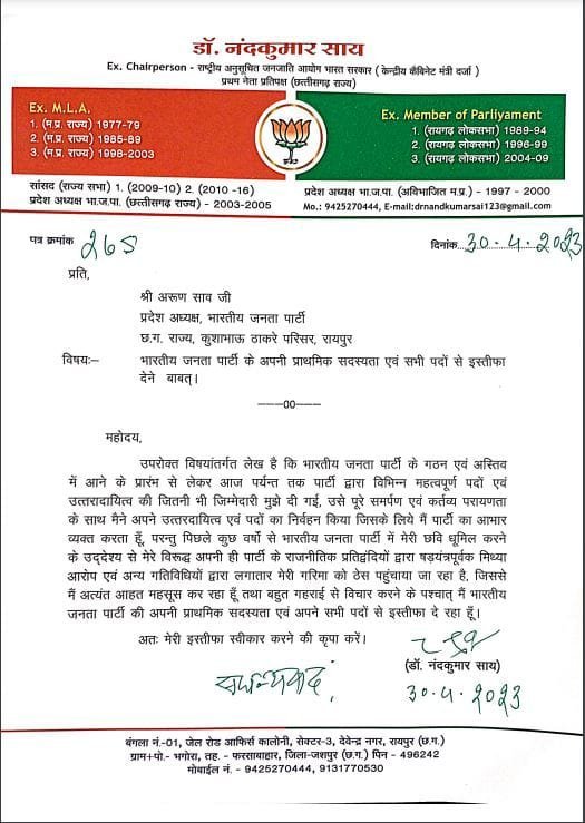 पूर्व विधायक,पूर्व राज्य सभा सांसद नंदकुमार साय के पार्टी छोड़ने का समाचार जंगल में आग की तरफ राजनैतिक गलियारे समेत देश प्रदेश में फैल चुका है। अब लगभग स्पष्ट होते जा रहा है कि बड़े-बड़े दिग्गज नेता जो जनसंघ से भाजपा तक पौधा को बरगद का पेड़ बनाने के लिए तन मन धन से अपना सहयोग किए आज बहुत पीड़ा से गुजर रहे हैं।