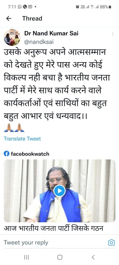 15 वर्ष के भाजपा शासनकाल में भी नंदकुमार साय सहित विगत आदिवासी नेताओं को और पिछड़ा वर्ग के दिग्गज भाजपा नेताओं को जो एक षड्यंत्र के तहत या तो पार्टी में किनारे लगा दिया गया या उन्हें पार्टी से निष्कासित कर दिया गया कुछ बच् गए हैं शायद वह भी घुटन महसूस कर रहे हैं। प्रदेश भाजपा का नेतृत्व लगभग 15 साल भाजपा शासनकाल में जो ताकतवर रहे वैसे ही लोग स्थापित हैं जिससे भी लोग घुटन महसूस कर रहे हैं अभी भी समय है केंद्रीय नेतृत्व को कि छत्तीसगढ़ के मामले को संज्ञान में लें। इसे हल्के से ना लें महल में दीमक लग चुका है कब पूरा महल भरभरा कर गिर जाएगा पता ही नहीं चलेगा।