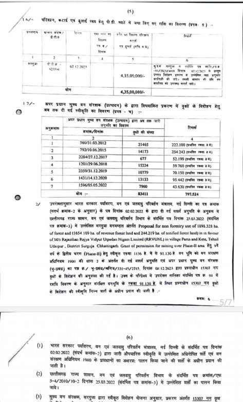 देखिये एक आदिवासी मुख्यमंत्री के नाम की सुगबुगाहट तय होते ही भाजपा के एक पुराने दिग्गज नेता ने कांग्रेस के एक नेता के खास रह चुके और भ्र्ष्टाचार की गाथा लिखे वन विभाग के मुख्य अधिकारी श्री निवास राव के साथ मिलकर एक खतरनाक षड्यंत्र के तहत केंद्र से पत्र आते ही 8 दिसम्बर को ही सरगुजा भेज आनन फानन में 11 दिसम्बर तक प्रक्रिया पूरी कर ली और विष्णु देव साय के शपथ से पहले ही पेड़ों की कटाई शुरू करवा दी जिससे आम लोगों में ये संदेश जाये कि एक आदिवासी मुख्यमंत्री वन सम्पदा के रक्षार्थ कुछ भी करने में असहाय हैं!