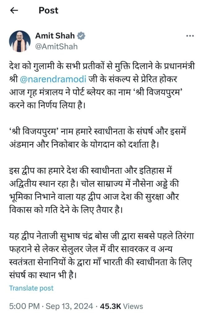 पोर्ट ब्लेयर का नया नाम ‘श्री विजय पुरम’।