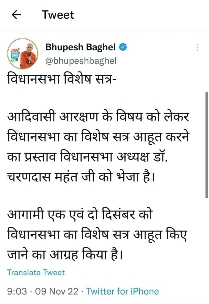 राज्यपाल के पत्र के अनुसार छत्तीसगढ़ सरकार ने विधानसभा का विशेष सत्र आमंत्रित करने के लिए फाइल आगे बढ़ा दी है सूत्र यह बता रहे हैं कि यह फाइल बहुत जल्द अनुमोदन के लिए राजभवन पहुंच जाएगी और आदिवासी आरक्षण को लेकर विधानसभा का विशेष सत्र आमंत्रित कर लिया जाएगा।