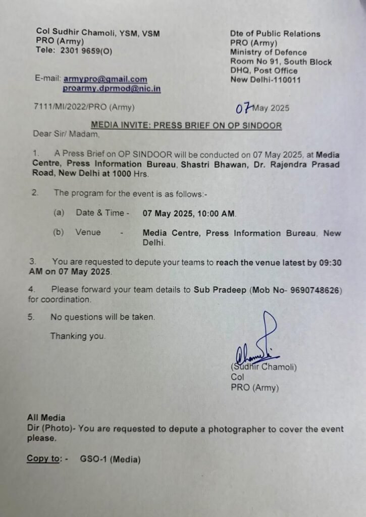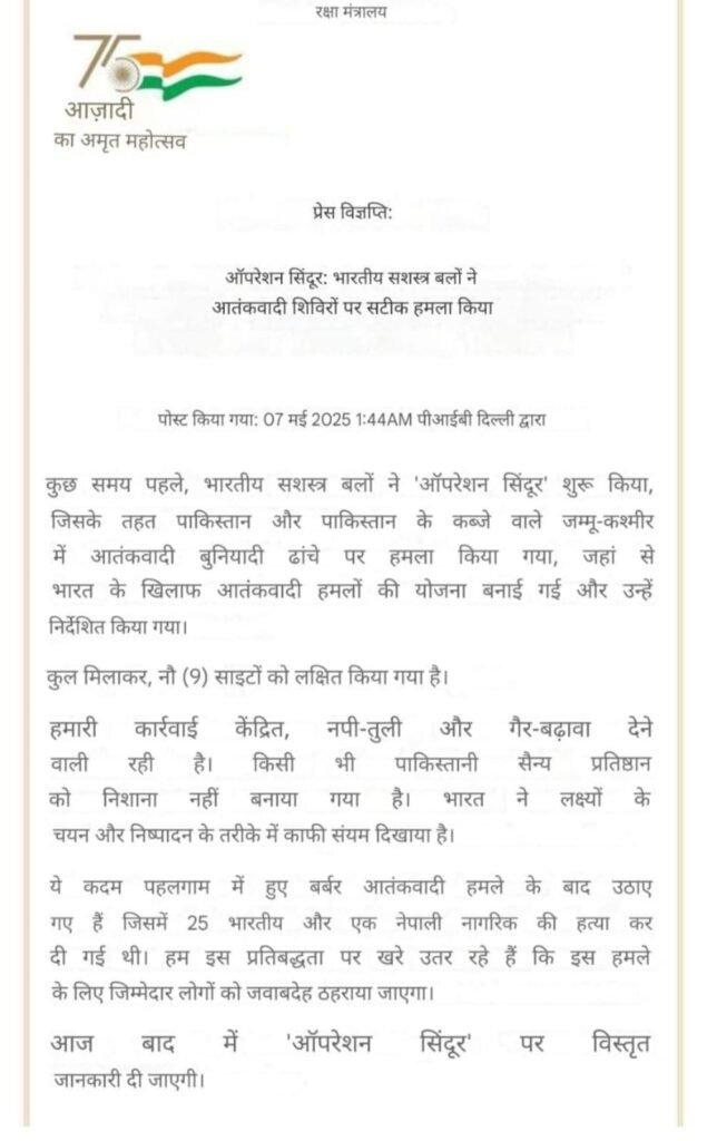 सुबह 10 बजे ऑपरेशन सिंदूर के बारे में विस्तृत जानकारी दी जाएगी।