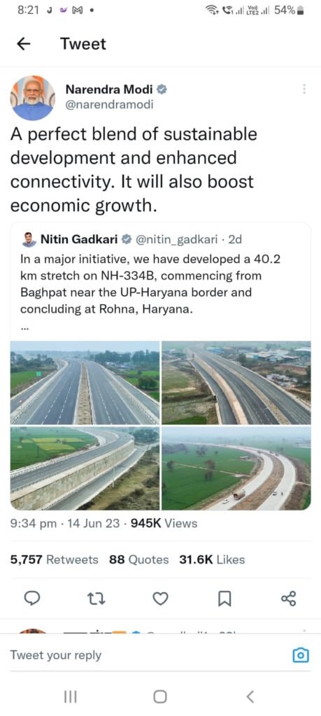 नितिन गडकरी के ट्वीट पर प्रधानमंत्री मोदी ने रीट्वीट कर लिखा कि आर्थिक समृद्धि में उछाल आएगी।