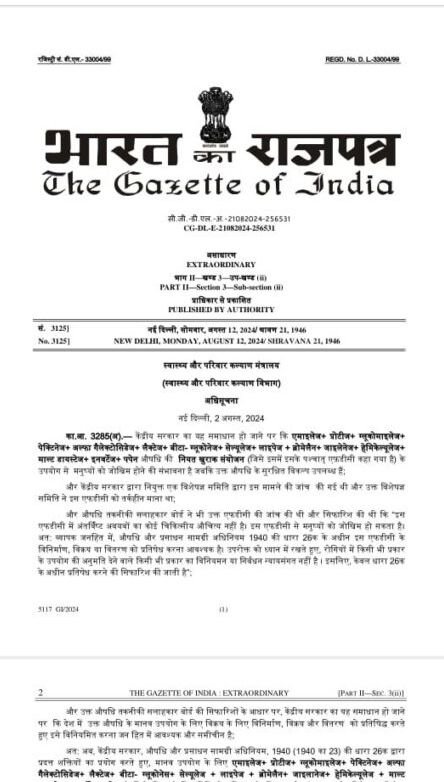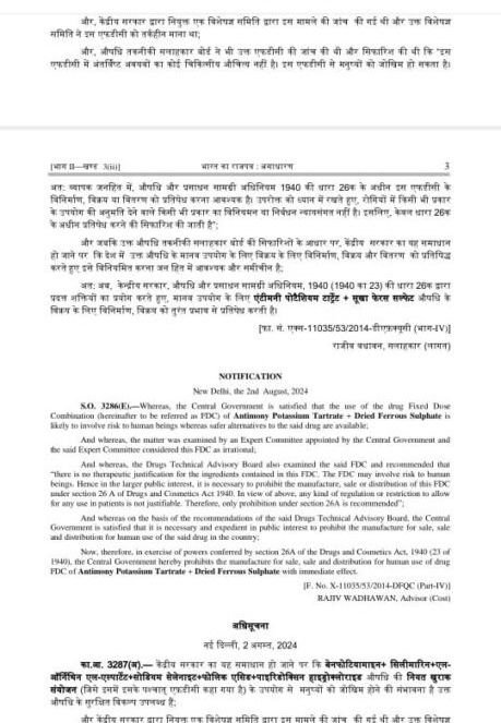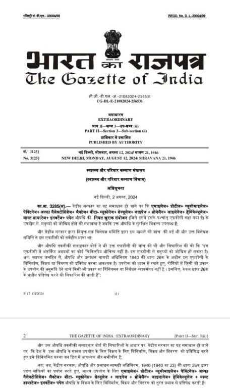12 अगस्त को केंद्रीय स्वास्थ्य मंत्रालय द्वारा जारी गजट अधिसूचना के अनुसार, सरकार ने शीर्ष फार्मा कंपनियों द्वारा पैन किलर दवाओं के रूप में उपयोग किए जाने वाले दवाओं में से एक ‘एसिक्लोफेनाक 50 मिलीग्राम पैरासिटामोल 125 मिलीग्राम टैबलेट’ पर प्रतिबंध लगा दिया है।