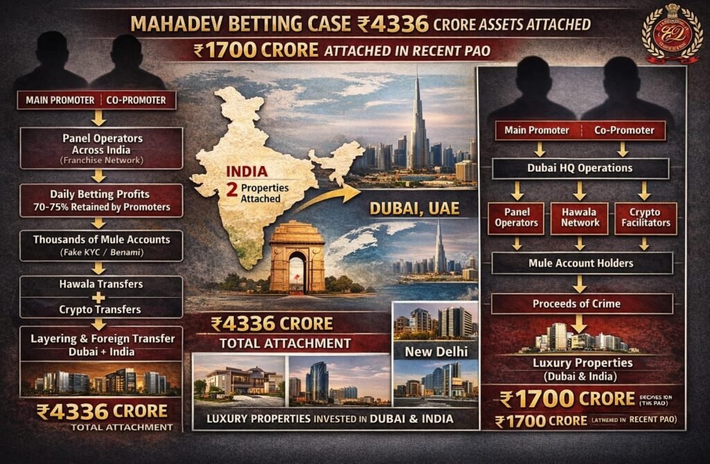 केन्द्रीय प्रवर्तन निदेशालय (ED) के रायपुर ज़ोनल कार्यालय ने महादेव ऑनलाइन बुक सट्टेबाजी मामले में बड़ी कार्रवाई करते हुए करीब 1700 करोड़ रूपये की भारतीय और विदेशी संपत्तियां अटैच की हैं। इन अटैच की गई कार्रवाई में आरोपी का एक प्रॉपर्टी जो बुर्ज खलीफा में स्थित है ,उस प्रॉपर्टी को भी अटैच कर लिया है ,यह कार्रवाई PMLA, 2002 के तहत 24 मार्च 2026 को जारी प्रोविजनल अटैचमेंट ऑर्डर (PAO) के जरिए की गई।
