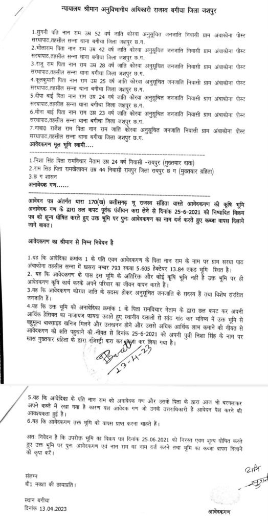 एसडीएम बगीचा को सौंपे गए आवेदन में आवेदिका सुगनी पति नान राम ने बताया है कि सरधापाठ अम्बाकोना में उसके पति नान राम की लगभग 5.605 हेक्टेयर ज़मीन है जहाँ वह अपने छ बच्चों के साथ रहती है।यहाँ वे जिस ज़मीन पर खेती करते थे उसे मुख्तयार ग्रहिता राय सिंह पिता रामखेलावन उम्र 44 निवासी रायपुर के द्वारा जून 2021 में छल कपट से रजिस्ट्री कराते हुए मुख्त्यारदाता निशा सिंह पिता रामविचार नेताम के नाम कब्जा कर नामांतरण करा लिया गया। सुगनी,भोलाराम,राजू राम,फूलकुमारी,दीपा बाई,मीना बाई,नाबा0 राजेश राम ने आवेदन में बीजेपी नेता रामविचार नेताम पर गंभीर आरोप लगाए हैं।