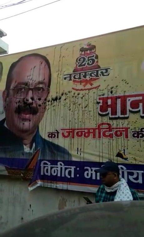 भाजपा प्रदेश अध्यक्ष के पोस्टर पर कांग्रेसियों ने फेंकी कालिख जिससे हंगामा हुआ।