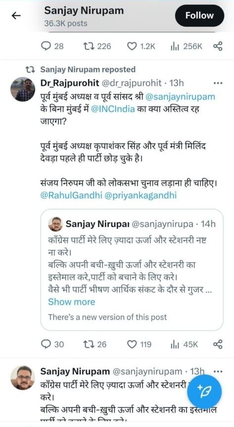 एक हफ़्ते पहले से ही संजय निरूपम अपने ट्वीट्स पर कांग्रेस पार्टी की वर्तमान हालत पर जिस तरह से ट्वीट कर रहे थे उससे ये आभास हो रहा था कि कई बड़े नेताओं की तरह वो भी कांग्रेस से रुष्ट हो चले हैं।