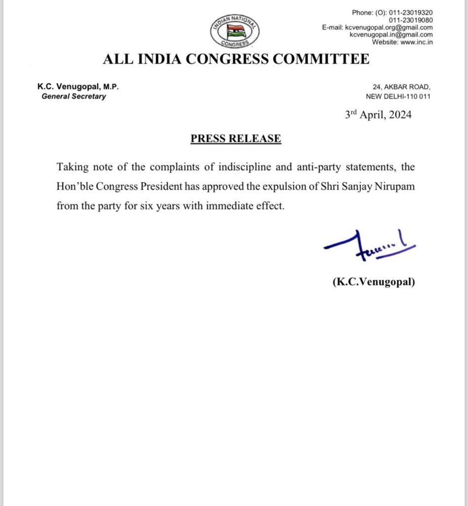 गौरतलब है कि निरुपम को कांग्रेस पार्टी के विरुद्ध बयान देने पर 6 साल के लिए पार्टी से निष्कासित कर दिया गया था।