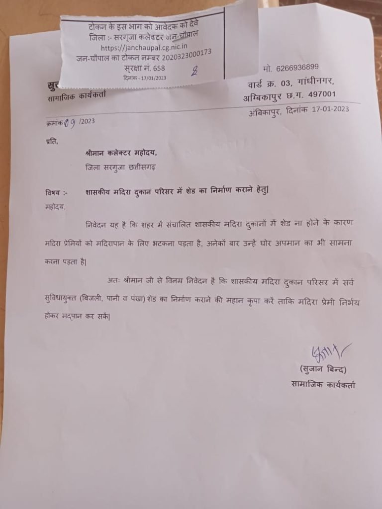 “अंबिकापुर शहर में तीन मदिरा दुकान हैं। जहां मदिरा प्रेमी मदिरापान करने जाते हैं किंतु शेड ना होने के कारण गली में रास्ते में शराब पीते हैं, जिसके कारण आने जाने वाले लोगों व मोहल्लेवासियों को परेशानी होती है। तत्संबंध में हमारा निवेदन था कि जब सरकार शराब बेच रही है तो शराबियों के लिए बैठने की उचित व्यवस्था हो ताकि वे शराब प्रेमी निर्भय होकर शराब पी सके।