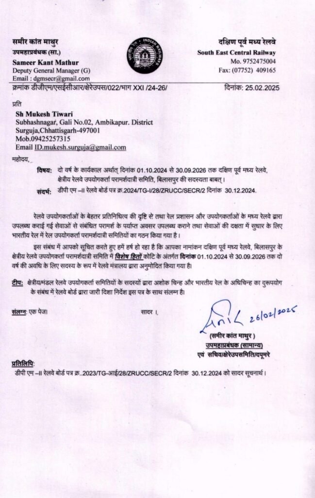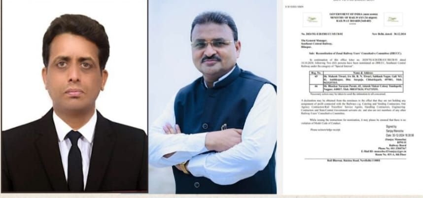 भाजपा नेता और सामाजिक कार्यकर्ता मुकेश तिवारी को रेल मंत्रालय के रेलवे बोर्ड जेडआरयूसीसी सदस्य के रूप में पुनः नियुक्त किया गया है। दक्षिण पूर्व मध्य रेलवे के उप महाप्रबंधक के पत्र में इस नियुक्ति का आदेश जारी हुआ है। क्षेत्रीय रेलवे उपयोगकर्ता सलाहकार समिति, उच्च स्तर की एक ऐसी समिति है जो रेल यात्रियों की आवश्यकताओं के मद्देनजर,सेवाओं में सुधार के लिए रेल मंत्रालय को परामर्श देती है।