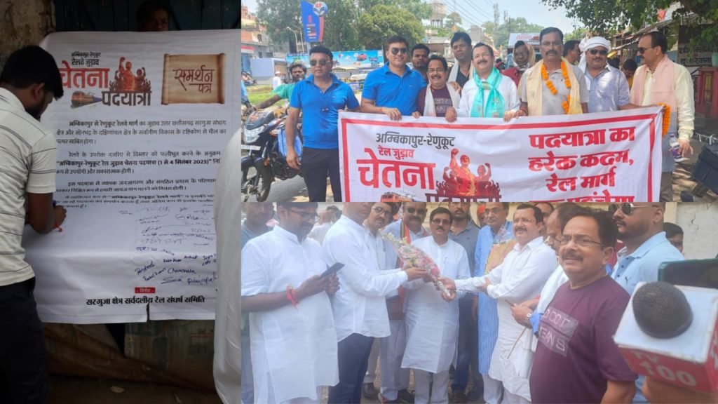 यह यात्रा उत्तर प्रदेश के रेणुकूट रेल्वे स्टेशन पर अंबिकापुर से गए कई लोगों के साथ यूपी से समाज कल्याण राज्य मंत्री संजीव गौड राबर्टसगंज के विधायक भूपेश चौबे रेल मंत्रालय के सदस्य श्रीकृष्ण गौतम की उपस्थिति में शुरू हुई।रेणुकूट से यह चेतना पदयात्रा मार्ग पर पड़ने वाले पूरे चिन्हांकित स्टेशनों से होते हुए अंबिकापुर में विशाल आम सभा का रूप लेते हुए पूरी होंगी।