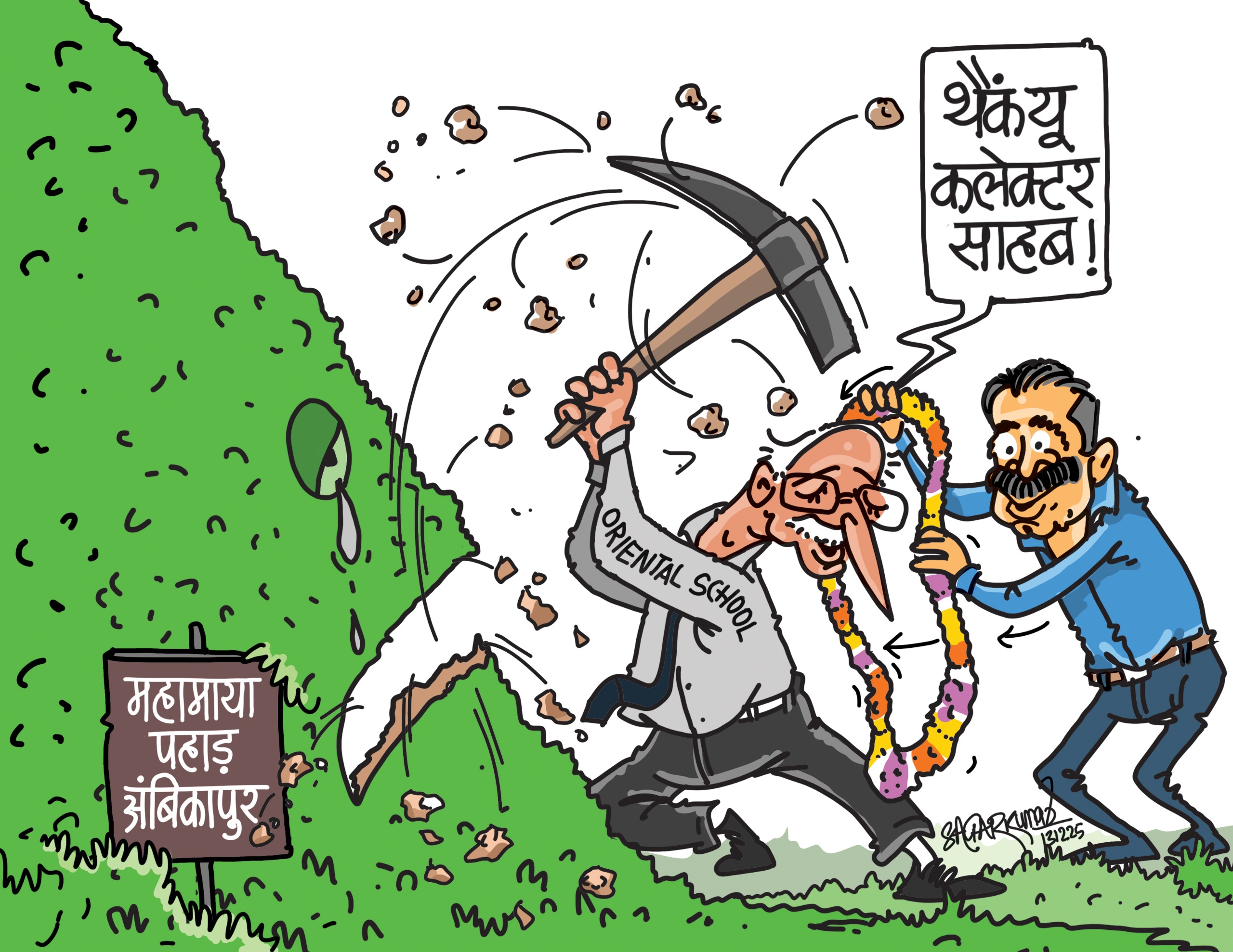 विवादों में सरगुजा कलेक्टर। महामाया पहाड़ पर आरोपों से घिरे ओरिएंटल पब्लिक स्कूल में जाकर वहां की प्रशंसा खुलकर की।देश विदेश के प्रसिद्ध कार्टूनिस्ट सागर ने इस विषय पर बनाया ज़ोरदार कार्टून, करारा व्यंग्य कर कहा “थैंक यू कलेक्टर साहब।”सवाल गंभीर कि कलेक्टर के लिए संविधान बड़ा या विवादित संस्थान?