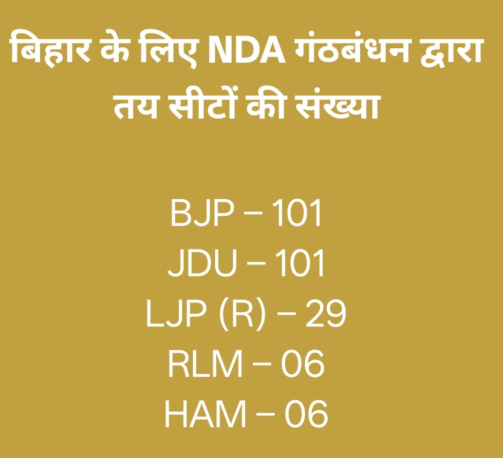 बिहार के लिए NDA गंठबंधन द्वारा तय सीटों की संख्या