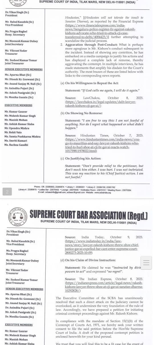– भारत के अटॉर्नी जनरल आर. वेंकटरमणि ने अधिवक्ता राकेश किशोर के खिलाफ सुप्रीम कोर्ट की आपराधिक अवमानना की कार्यवाही शुरू करने की अनुमति दे दी है। यह अनुमति अदालत की अवमानना अधिनियम, 1971 की धारा 15(1)(b) के तहत सुप्रीम कोर्ट बार एसोसिएशन के अध्यक्ष विकास सिंह को दी गई है।