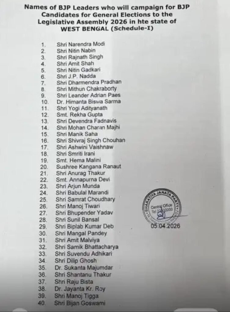 भाजपा के केंद्रीय संगठन ने पश्चिम बंगाल विधानसभा चुनाव के लिए 40 स्टार प्रचारकों की सूची जारी की है।